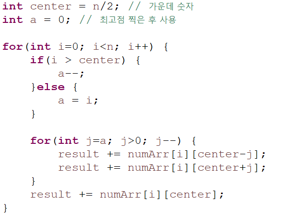 밭의 크기는 항상 홀수로 주어지기에 가운데 숫자를 중심으로 문제를 풀었다.