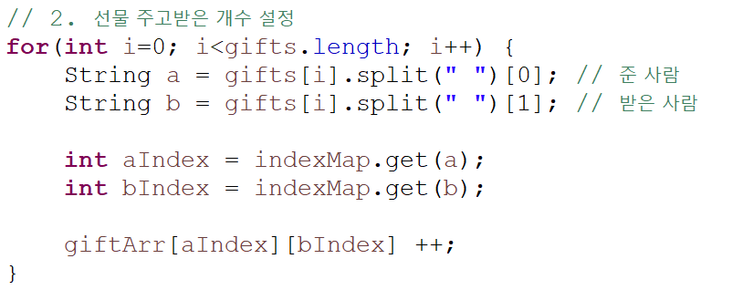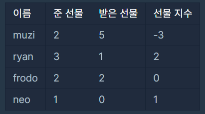 프로그래머스에서 표현해놓은 표처럼 2차원 배열, giftArr에 값 저장한다.
