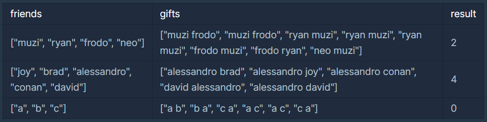 주어진 gifts 배열의 각 원소에서 선물 준 사람과 받은 사람을 구한다.