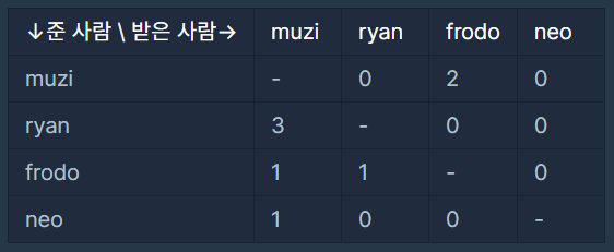 각각의 식별번호를 사용하여 giftArr[준 사람 식별번호][받은 사람 식별번호]의 값을 +1한다.