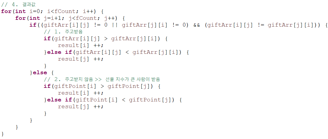 위의 조건을 만족하면 giftArr 배열을 통해 선물을 더 많이 준 사람을 판단한다.