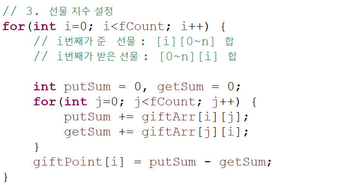 giftArr 배열의 가로의 값을 모두 더하면 선물 준 개수를 구할 수 있다.