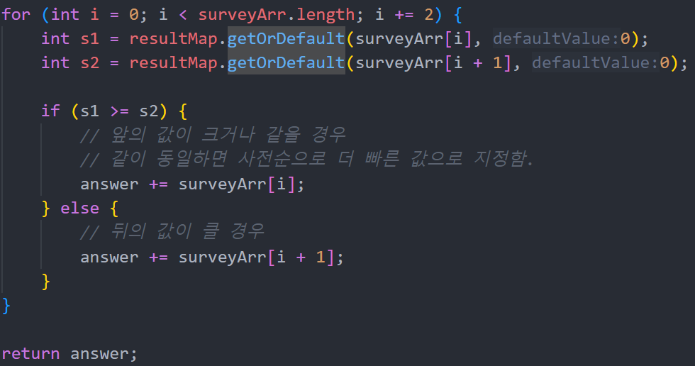 조건문을 사용하여 점수가 더 큰 값을 찾아 answer에 해당 성격을 저장하였다.