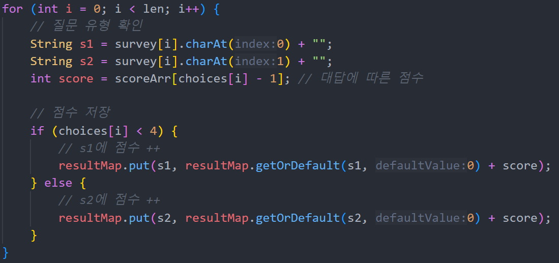 조건문을 사용하여 choices[i] 값이 4 미만일 경우에는 앞의 성격 유형에 점수를 추가하고