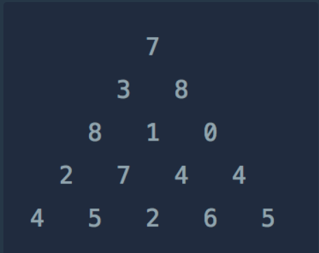 위와 같은 삼각형의 꼭대기에서 바닥까지 이어지는 경로 중, 거쳐간 숫자의 합이 가장 큰 경우를 찾아보려고 합니다.