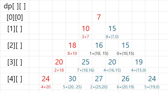dp[i][j] = triangle[i][j] + Math.max(dp[i - 1][j - 1], dp[i - 1][j]);