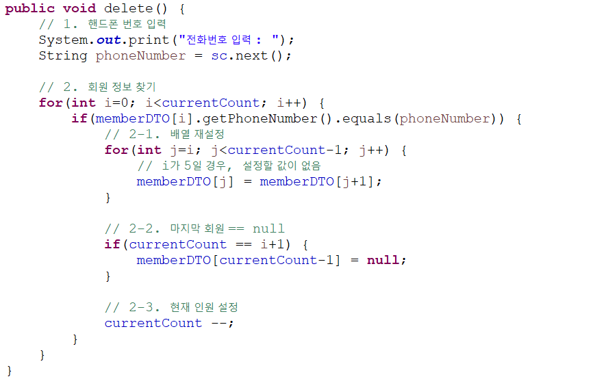 예를 들면 현재 인원이 5명이고 입력받은 전화번호가 동일한 배열은 memberDTO[2]이라고 가정하겠다.