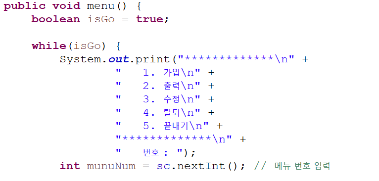 사용자가 5번 메뉴를 선택하기 전까지 계속 메뉴를 출력하여야 하기에 while 문 사용