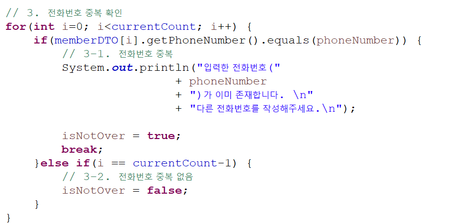 전화번호가 중복되지 않고 배열의 모든 원소들을 다 살펴보았을 때, isNotOver의 값을 false로 설정하여 while문을 빠져나가도록 설정한다.