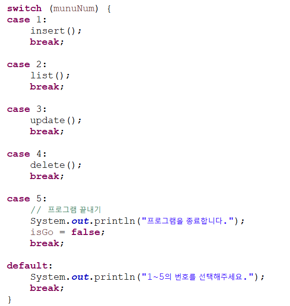 5번을 선택할 경우, isGo = false가 되어 프로그램이 종료된다.