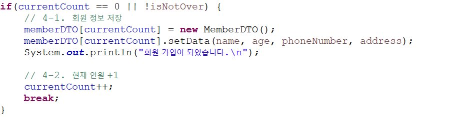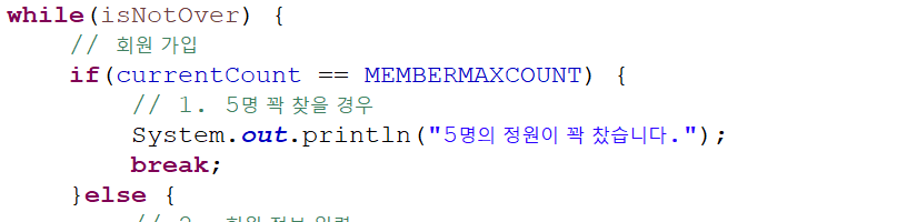 if문의 조건을 보면 현재 인원수가 5일 경우에는 더이상 회원가입을 받지 않고 그에 따른 문구를 출력한다.