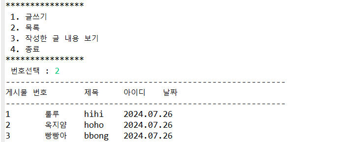 System.out.println("게시물 번호\t제목\t아이디\t날짜");