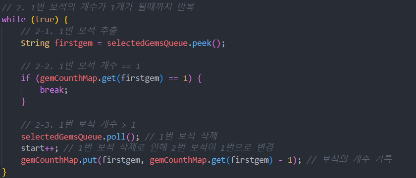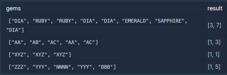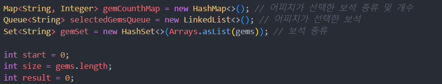 >> gems의 길이로 설정한 이유는 보석 리스트의 크기와 비교하기 위해서 큰 값이 필요함