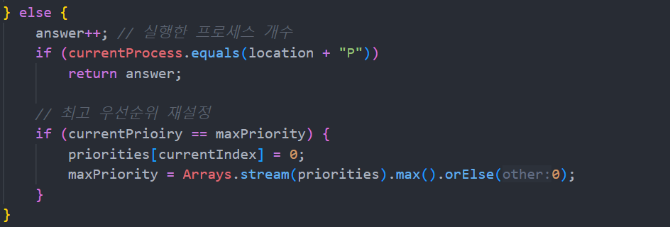 int currentPrioiry = priorities[currentIndex]; // 현재 프로세스 우선순위