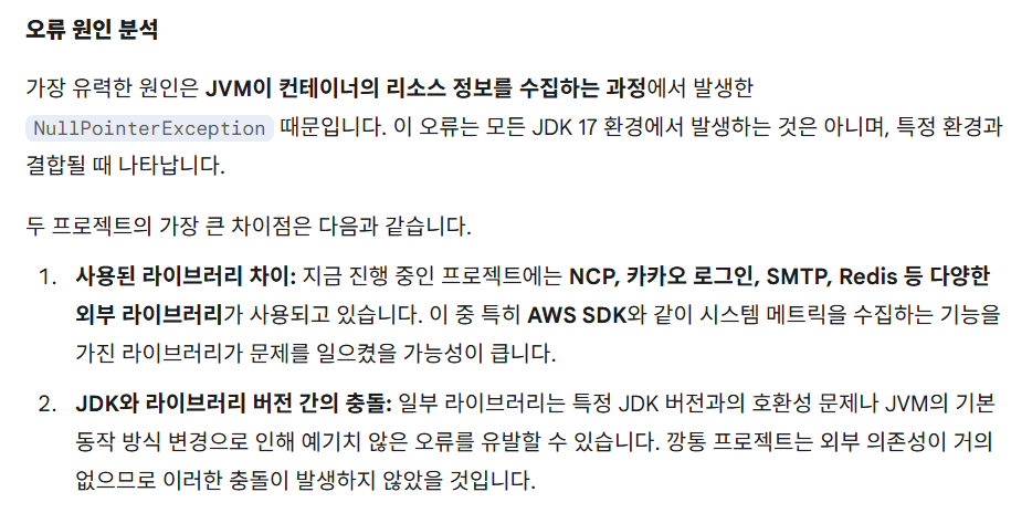 계속 동일하게 아래와 같은 로그가 발생했고, 이는 JDK 17과 컨테이너와의 상호작용 문제일 수도 있다고 했다.