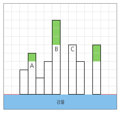 아래와 같이 강변에 8채의 빌딩이 있을 때, 연두색으로 색칠된 여섯 세대에서는 좌우로 2칸 이상의 공백이 존재하므로 조망권이 확보된다. 따라서 답은 6이 된다.